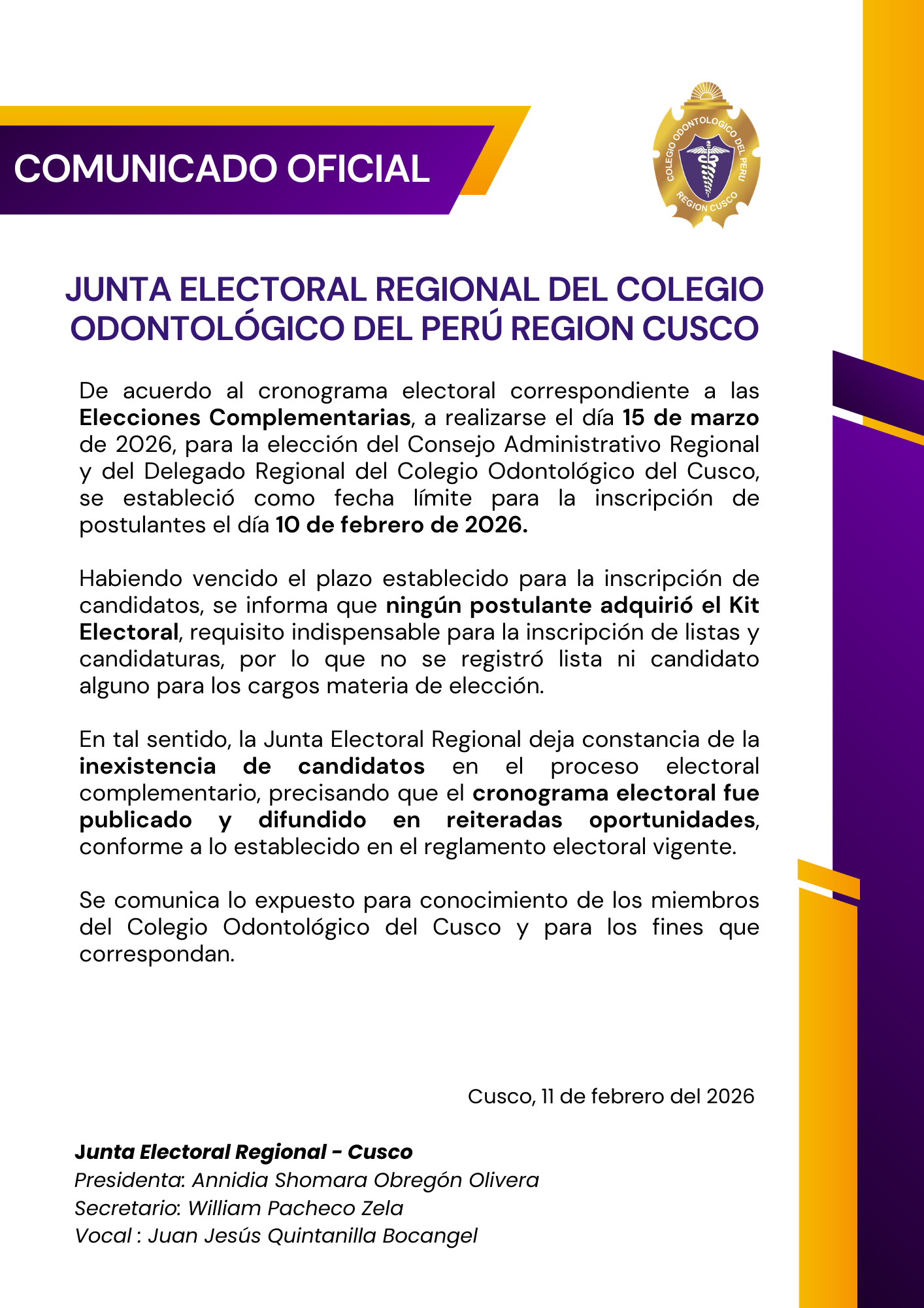 Infórmate sobre las disposiciones más recientes, comunicados oficiales y mensajes importantes emitidos por nuestra institución. Esta sección reúne toda la información necesaria para que nuestros colegiados estén al tanto de decisiones, eventos protocolares, campañas institucionales y otros avisos que fortalecen nuestro compromiso con la profesión odontológica